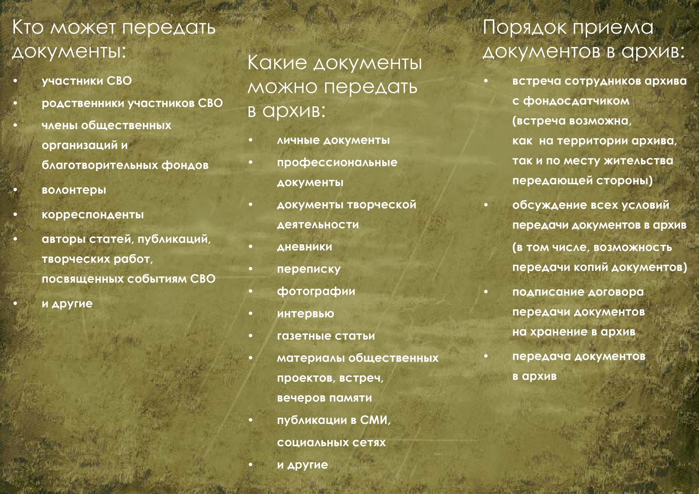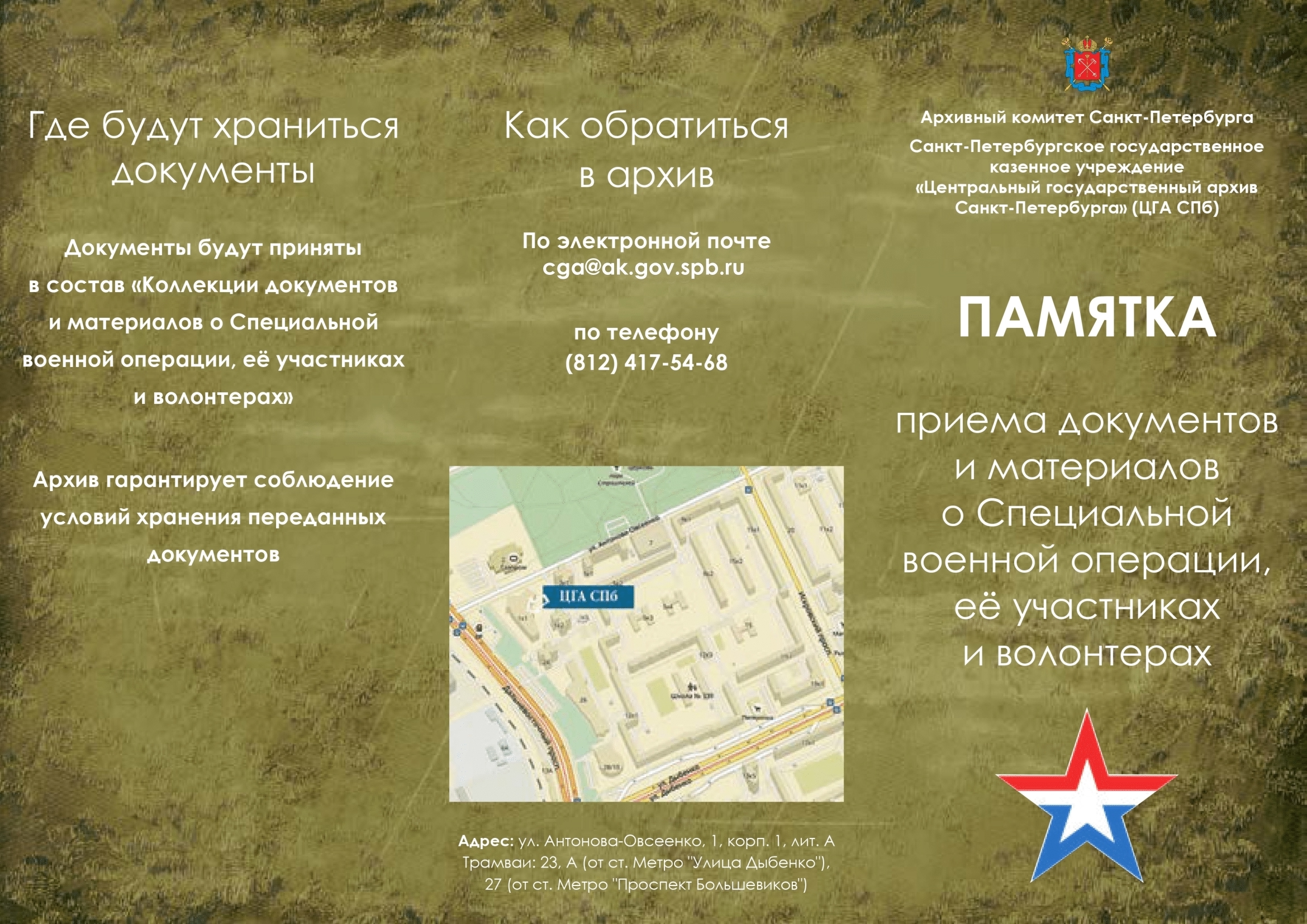 Санкт-Петербургское государственное казенное учреждение «Центральный государственный архив Санкт-Петербурга» (далее – ЦГА СПб) собирает архивные документы не только непосредственных участников специальной военной операции (далее – СВО), членов их семей и волонтеров, но и всех государственных и общественных организаций Санкт-Петербурга, а также фондов, оказывающих различную поддержку СВО и ее участникам, формируя таким образом Коллекцию.