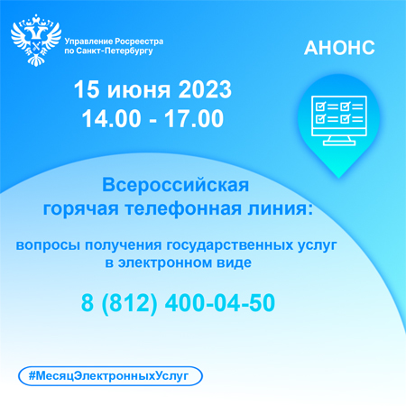 15 июня Управление Росреестра по Санкт-Петербургу примет участие во Всероссийской горячей телефонной линии по вопросам получения государственных услуг в электронном виде.