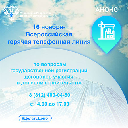 16 ноября Управление Росреестра по Санкт-Петербургу примет участие во Всероссийской горячей телефонной линии по вопросам государственной регистрации договоров участия в долевом строительстве.