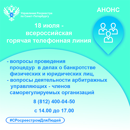 18 июля Управление Росреестра по Санкт-Петербургу примет участие во Всероссийской горячей телефонной линии по вопросам проведения процедур, применяемых в делах о банкротстве физических и юридических лиц, в том числе деятельности арбитражных управляющих – членов саморегулируемых организаций.