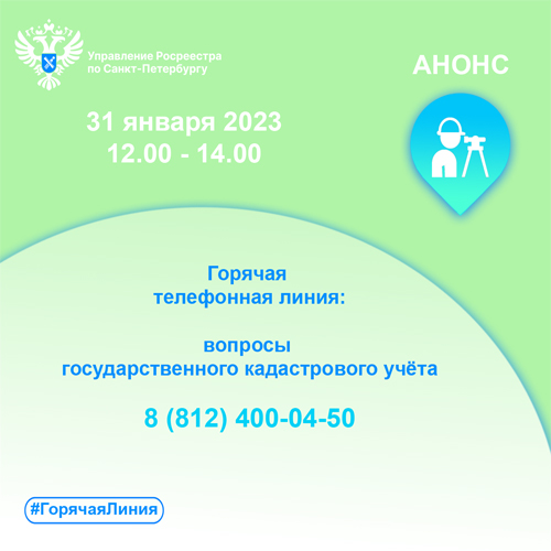 Управление Росреестра по Санкт-Петербургу проведёт 31 января 2023 года горячую телефонную линию для кадастровых инженеров: «Вопросы государственного кадастрового учёта».