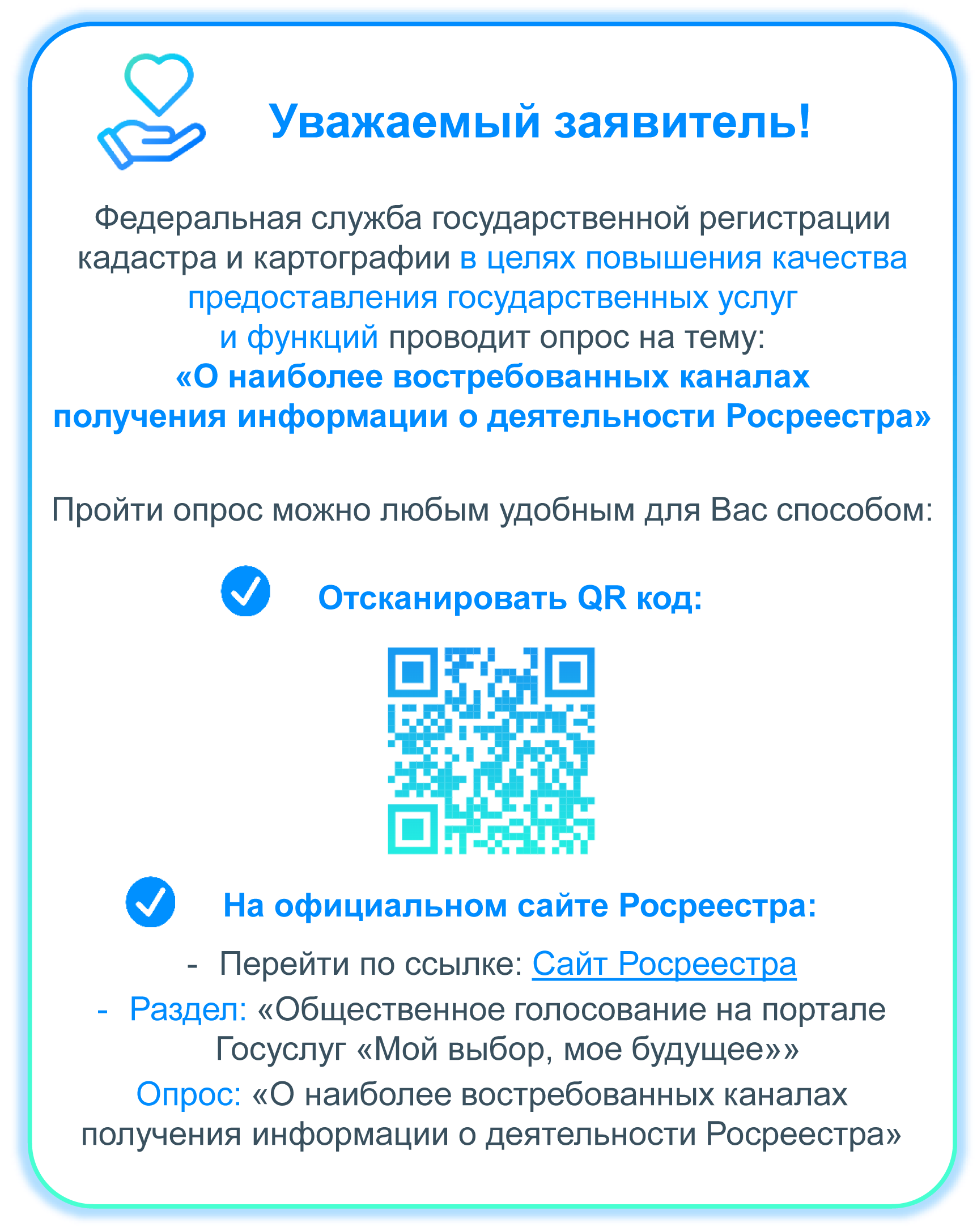 В целях повышения качества предоставления государственных услуг и функций приглашаем вас принять участие в опросе Росреестра на тему: «О наиболее востребованных каналах получения информации о деятельности Росреестра».