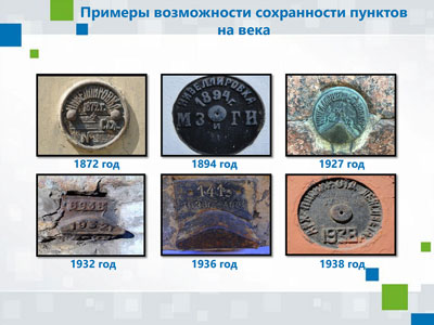 С примерами центров и реперов, закладываемых на пунктах геодезических и нивелирных сетей, расположенных на территории Санкт-Петербурга, можно ознакомиться в разработанной специалистами Управления Росреестра по Санкт-Петербург памятках «Как выглядят геодезические пункты?» и«Обеспечение сохранности геодезических, нивелирных и гравиметрических пунктов, расположенных на территории Санкт-Петербурга».