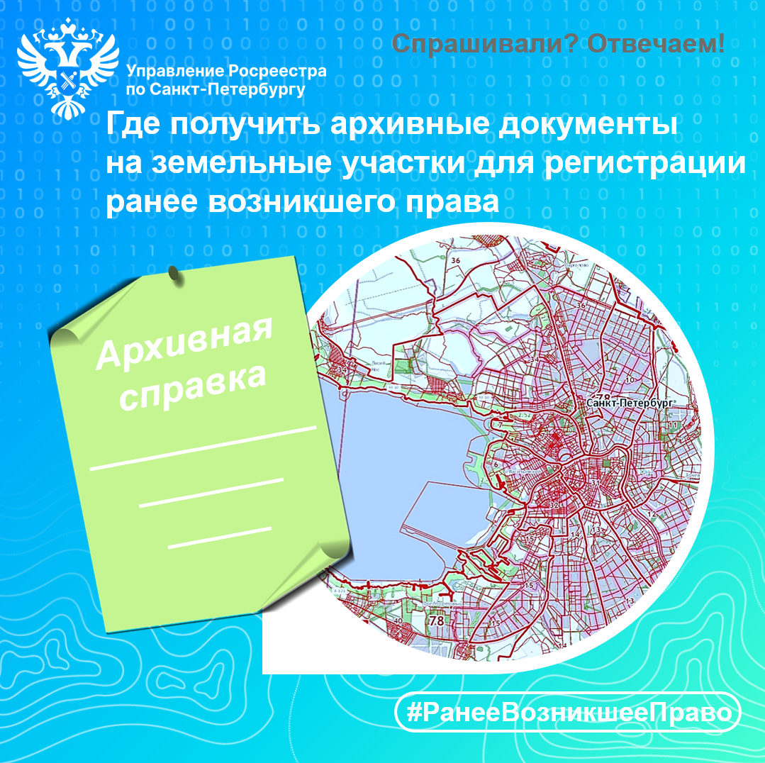 Вопрос: Мне необходимо оформить документы на земельный участок, расположенный в Петербурге. Участок мне принадлежит с 1996 года. Где можно получить архивные материалы и документы, относящиеся к регистрации прав?