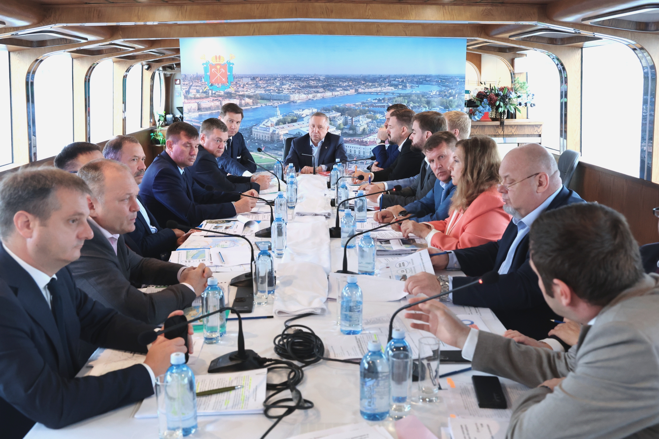 Губернатор Александр Беглов провел сегодня выездное совещание с членами городского правительства, которое прошло на воде - в акватории Невы. Его участники осмотрели город с борта судна. Особое внимание было уделено объектам благоустройства и общественным пространствам, вид на которые открывается с Невы.