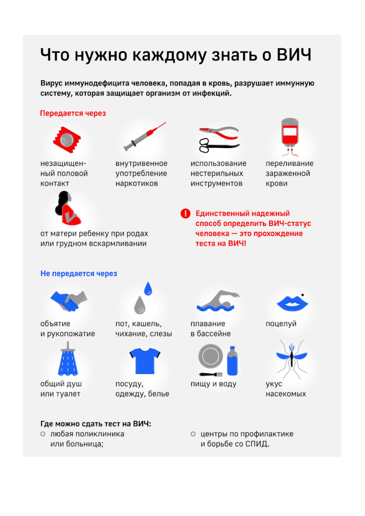 Существует три пути передачи ВИЧ-инфекции: половой путь (при сексуальных контактах), передача от инфицированной ВИЧ матери ее ребенку, а также передача с зараженной ВИЧ кровью при ее попадании во внутренние среды организма, например, при переливании крови или с загрязненными такой кровью инструментами, чаще всего иглами и шприцами. Самый частый путь заражения ВИЧ – при половых контактах. Чем больше у человека было половых партнеров, тем риск выше. Еще большему риску заражения подвергаются люди, употребляющие наркотики. Самый минимальный риск заражения имеют люди, которые никогда не жили половой жизнью и не потребляли наркотиков, но, к сожалению, встречаются и отдельные случаи заражения ВИЧ из-за нарушений при оказании медицинской помощи. Часто люди забывают о своих рисках заражения ВИЧ или недооценивают степень этих рисков. Поэтому мы рекомендуем всем россиянам регулярно проходить тестирование на ВИЧ. Это совсем не сложно, но может спасти здоровье и жизни людей. Для всех подойдет тестирование один раз в год. А людям, которые продолжают подвергать себя риску заражения, например, часто меняют половых партнеров, нужно обследоваться как можно чаще и лучше всего вместе с партнерами. Чем раньше будет поставлен диагноз, тем скорее начнется лечение и меньше будет передаваться ВИЧ-инфекция.